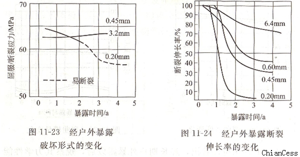 圖11-23表明0.45mm厚的板材的破裂狀態是以塑性破壞代替了0.20mm厚的板材脆性破壞。圖11-24是經戶外暴露后斷裂伸長率的變化,同樣也是板材越厚,斷裂伸長率的變化越小。