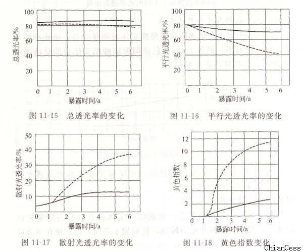 長期暴露于戶外,各種性質發生變化的試樣:耐候級無色透明聚碳酸酯耐力板(厚5.0mm)面南35。,圖11-15~圖11-22中虛線表示普通級無色透明聚碳酸酯實耐力板。